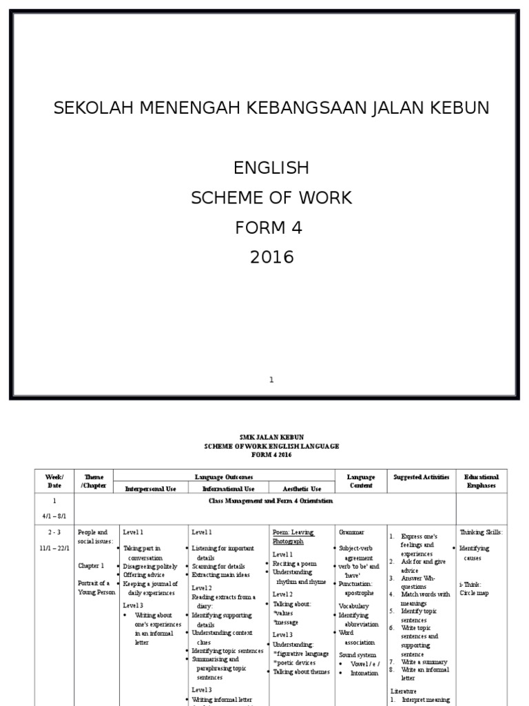 Scheme Of Work English Form 4 2016 Doc Document