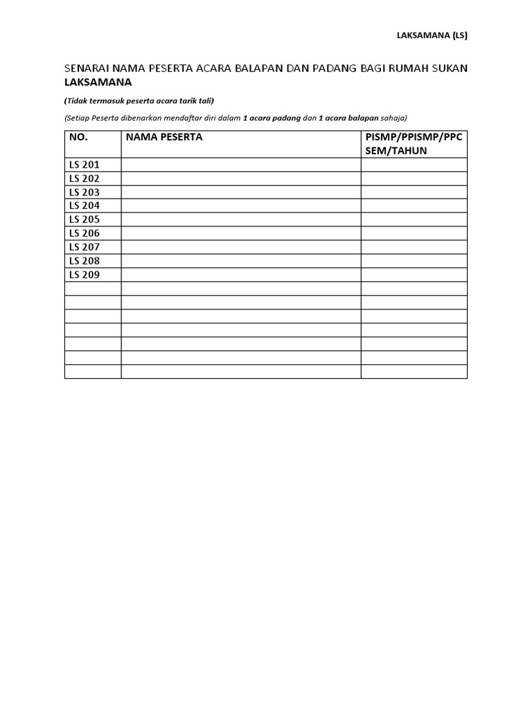 Laksamana Senarai Nama Peserta Acara Balapan Dan Padang Bagi Rumah Sukan
