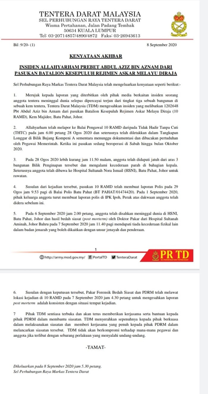 Tiada Unsur Jenayah Dera Pada Kes Kematian Prebet Aziz Tentera Darat Tun Carlos