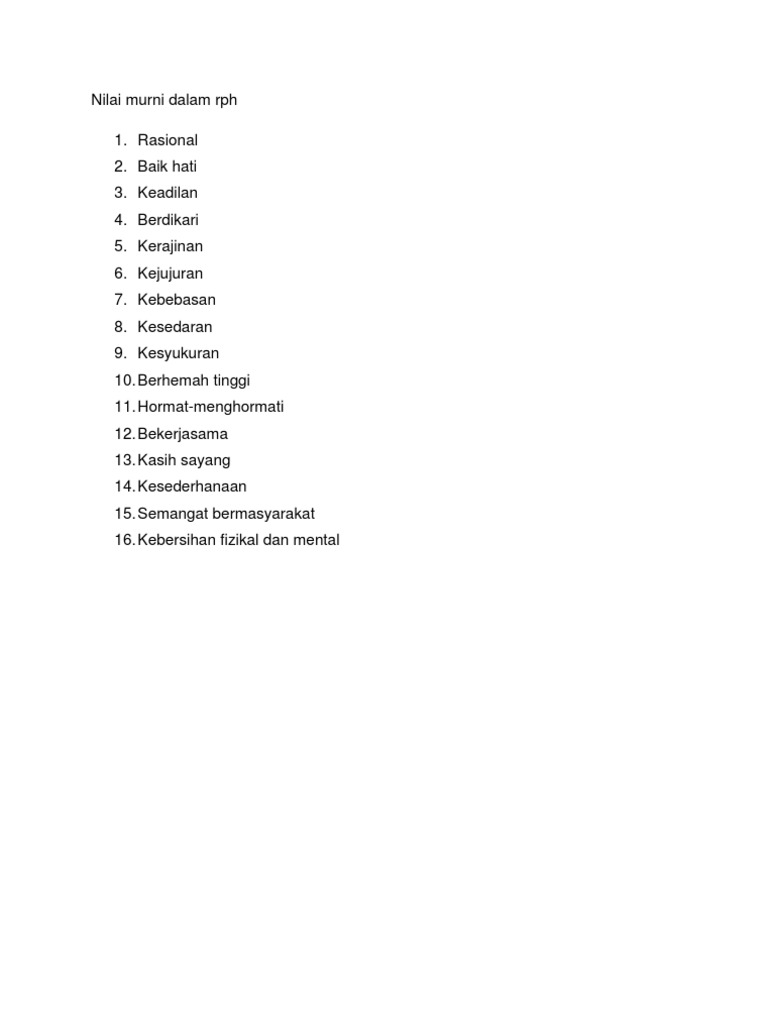 Senarai Nilai Murni Dalam Rancangan Pengajaran Harian