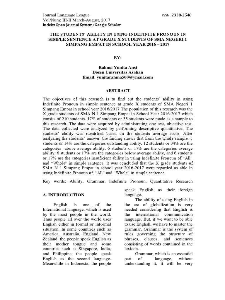 The Students Ability In Using Indefinite Pronoun In Simple Sentence At Grade X Students Of Sma Negeri 1 Simpang Empat In School Year 2016 2017 Grammatical Number Plural